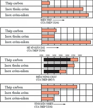 So với thép carbon, thép không gỉ - cả loại thuần crôm (martensitic và ferritic) và loại crôm-niken (austenitic) – đều có điện trở lớn hơn và tính dẫn nhiệt thấp hơn.